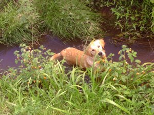 On the nicest day in a week, I picked up the Collins girls (my friends’ two labs) and took Penny and them out to the country for a romp. Upon arrival at the county park, we discovered a trout fisherman working the creek. No big deal.